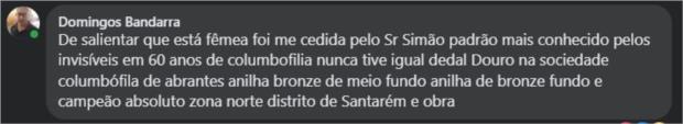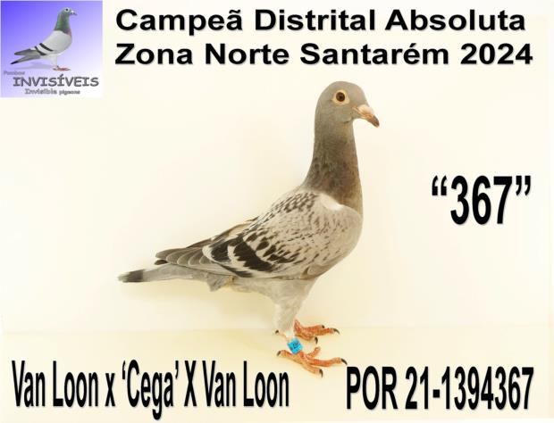 Apresento a 367/21 Campeã Distrital Absoluta Zona Norte Santarém com mais de 1500 pontos de avanço para a concorrência. Um autêntica crack nascida e anilhada aqui em casa, voada por Domingos Bandarra no Distrito de Santarém. Esta fêmea no ano passado já tinha marcado: 1º, 2º, 3º, etc. Diz o amigo Domingos que em 60 de pombos anos nunca teve uma crack como esta. O pai dela também é avô da anilha de Ouro de Sector e 3º de todo o Distrito de Aveiro em Fundo há 2-3 anos. Linha Van Loon com 'Cega', pedigree em anexo. Segue a foto dela em borracha antes de seguir para Santarém, as fotos dela partilhadas recentemente pelo proprietário, e algumas informações. Publico este resultado porque é público e já partilhado pelo proprietário.