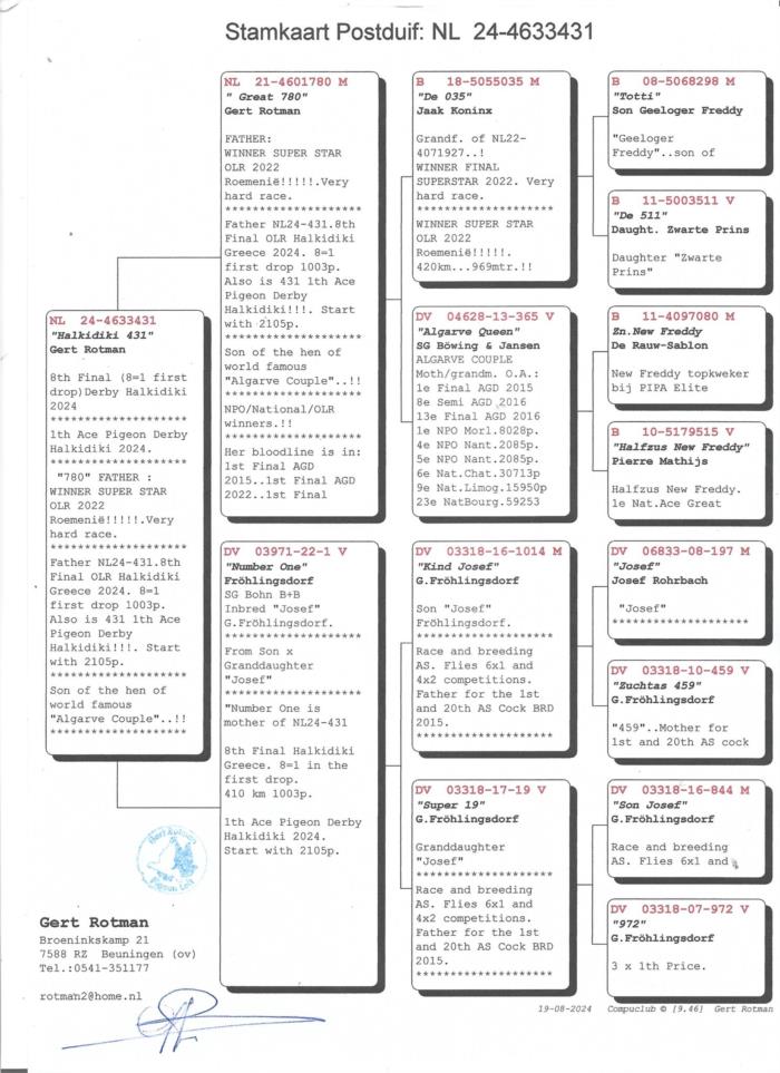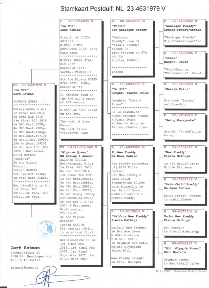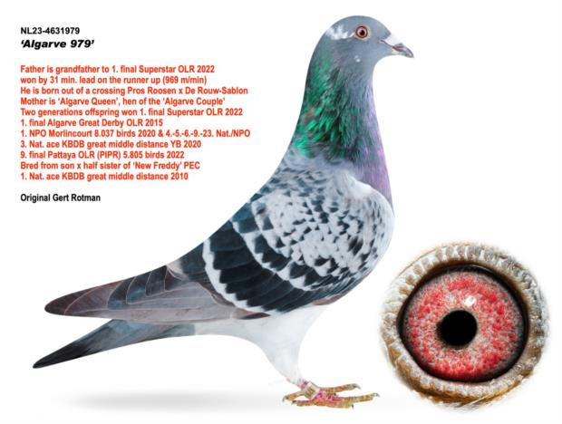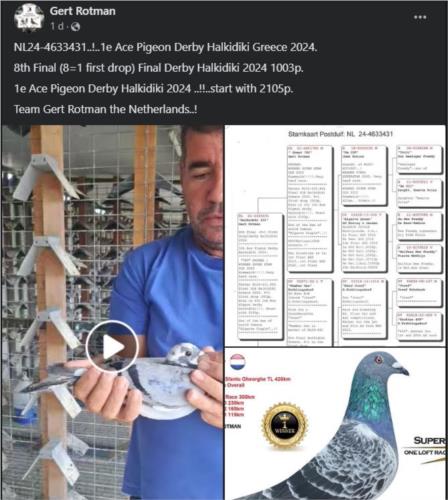 No passado domingo, 18Ago, Gert Rotman venceu o 1º pombo Ás no derby Halkidiki na Grécia, esse pombo foi 8º na Final (chegou no primeiro bando). O pai desse campeão é irmão legítimo da nossa 'Rotal' adquirida no ano passado, sendo a penúltima filha da 'Algarve Queen' a sair dos pombais Rotman, só saiu mais uma para a China. São muitos, mas mesmo muitos pombos campeões em Derbys e campeonatos com ligações a esta fêmea.