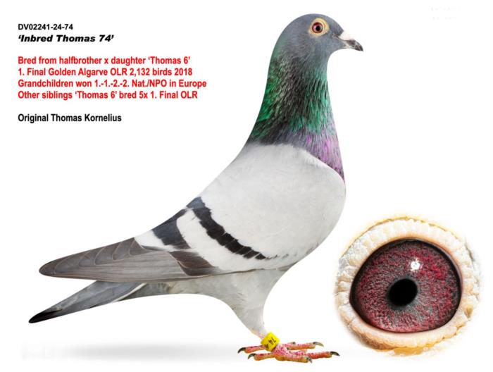 Original Thomas Kornelius, cruzamento de um meio irmão com uma filha do Thomas 6, vencedor do Golden Race '18 com 24 minutos de avanço (comprado por Mike Ganus onde se tornou um excelente reprodutor). Linha do famoso Romário de Hallmann (origens Ad Schaerlaeckens), um dos melhores reprodutores para Derbies, já 3 descendentes do Romário venceram o Golden Race ('18-'19-'24), além do Victoria Falls e outros grandes derbies. Também linha do Josef de Georg Fröhlingsdorf venceu 6X1º e 4X2º, os seus descendentes venceram mais de 28X1º e pombos Ás. Um dos melhores reprodutores da Alemanha. O Thomas 6 e vários irmãos são excelentes reprodutores, ele é avô de 1º e 2X2º Nacional contra 6 mil pombos, etc, uma irmã é avó do vencedor do Moledo 2023, outra é mãe do 1º Ás Regional entre mais de 7 mil pombos e do 1º Ás entre mais de 4 mil p., outro irmão é pai de: 1º 3.189 p. 1º 1.859 p., 2º 1.260 p. 3º 3.327 p. 7º 2.614 p., etc, etc Linha de pombos que tem vencido prestigiados prémios, tanto em grandes derbies como em provas de campeonatos, pombos Ás, etc, em vários países em vários continentes. É disto que procuro, pombos com variadíssimos parentes próximos a ganhar a nível Nacional e mundial em diversas linhas de parentesco. Este é muito semelhante aos seus ascendentes ganhadores. Um reforço para reproduzir para competir em campeonatos ou cruzar com outras linhas talhadas para derbies que também possuimos. Acompanhado por certificado de ADN.