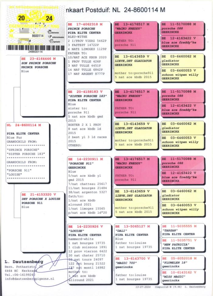 Vindo da Holanda mas filho de 2 originais PIPA, cruzamento de uma filha do Porsche 911 com um filho do Prince Porsche, dosi super reprodutores desta linhagem. É ainda neto da Sister Porsche e da Louise. Consanguíneo do casal de Ouro Wacko Freddy x Lieve. Uma Super Linhagem para MF e Fundo que se tem destacado com descendentes a vencerem a sério por todo o mundo. Porsche 911: 5º Ás Nac. Pigeon MF Longo YLs KBDB ’15 7º Nac. Chateauroux 25,710 p. 11º Nac. Bourges 21,522 p. 52º Nac. Montluçon 16,982 p. 38º Nac. Zona Argenton 5,327 p. Super Reprodutor desta linhagem!