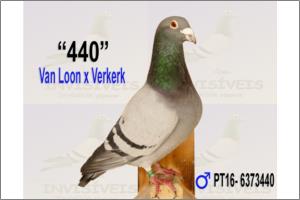 | Pai: 6373440/16 POR - "440 Van Loon x Verkerk" | Mãe: 6373470/16 POR - "470 700 X 111" | "440 Van Loon x Verkerk" Azul, Van Loon x Verkerk Pai da anilha de Ouro Fundo Portimão 2021 e 3º Clube Fundo Algarve Avô da 1º Distrital de Faro contra mais de 4.500 p. Filho de dois Grandes Reprodutores: O macho do Casal 200 Super reprodutor, pai e avô de inúmeros cracks mesmo a nível Nacional, Mãe pura Verkerk linhas de fundo já com excelentes resultados. Com a 470/16 já obteve grandes resultados de fundo.