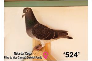 | "Escura 524" Pedrada Escura, neta da cega, mãe e avó de excelentes voadores e reprodutores. Grande voadora principalmente de fundo. No último ano a voar 9 prémios 5 em fundo onde foi 2, 2, 3 do pombal. Filha da Vice-Campeã Distr. Porto Fundo '10. Tia dos super cracks 588/15 e 555/15 que venceram 6X1º num ano vários a nível de Zona +- 6.000 p. Linhagem de pombos super resistentes.