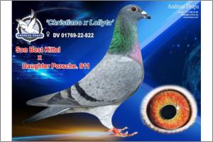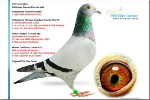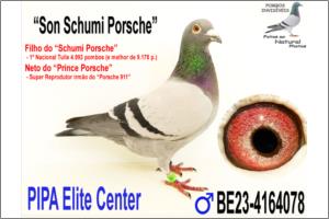 "Son Schumi Porsche" Azul, original PIPA, filho do Schumi Porsche que venceu 1º Nacional Tulle contra 4.993 pombos e mais rápido de 9.178 p., 29º Reg Toury 762 p. O Schumi é filho de um irmão legítimo do Porsche 911. Filho da Princes Shaina que é mãe e avó de vários pombos com classificações de topo Nacional, é meia-irmã do Olympic Bourges: 1º Olímpico Cat B '19, é filha do Prince Porsche - Super reprodutor irmão do Porsche 911