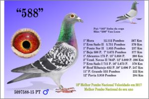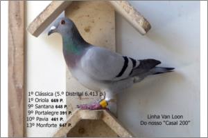"435 C200" Azul, Van Loon Pai do: 779/19: 1º Clube 411 pombos, 2º Zona N Distrital 1.874 p. e 3º Distrital Santarém contra 3.730 p. 713/19 1º Clube, 3º Bloco 1.271 p. e 9º de Zona 2.655 p. Filho do casal 200, casal a dar Super voadores e Super Reprodutores com netos de nível top Nacional. Vários irmãos deste macho já reproduziram vencedores de tops Distritais.