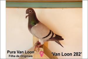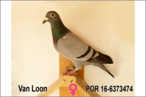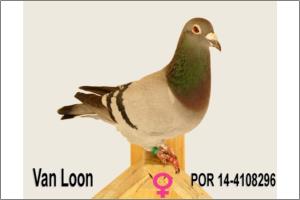 "Van Loon 296" Azul, Van Loon, Excelente fêmea, em 3 anos marcou mais de 20 prémios, várias vezes fez equipa. Filha do casal 200, casal a dar Super voadores e Super Super Reprodutores com netos do melhor que há a nível Nacional. Mãe e avó de excelentes pombos, incluindo Anilha Ouro Fundo Sector e 3º de todo o Distrito de Aveiro Fundo.
