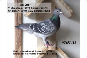"745" Pedrada, grande crack voadora, 1º Mora contra 6.071 p. 5º 828 p. e 20º Zona contra 6.502 p. 12 prémios no seu 2º e último ano que viajou. Mãe e avó de vários cracks voadores e reprodutores em vários pombais. Filha do Kannibaal, Alemão, pai de vários pombos de Topo.